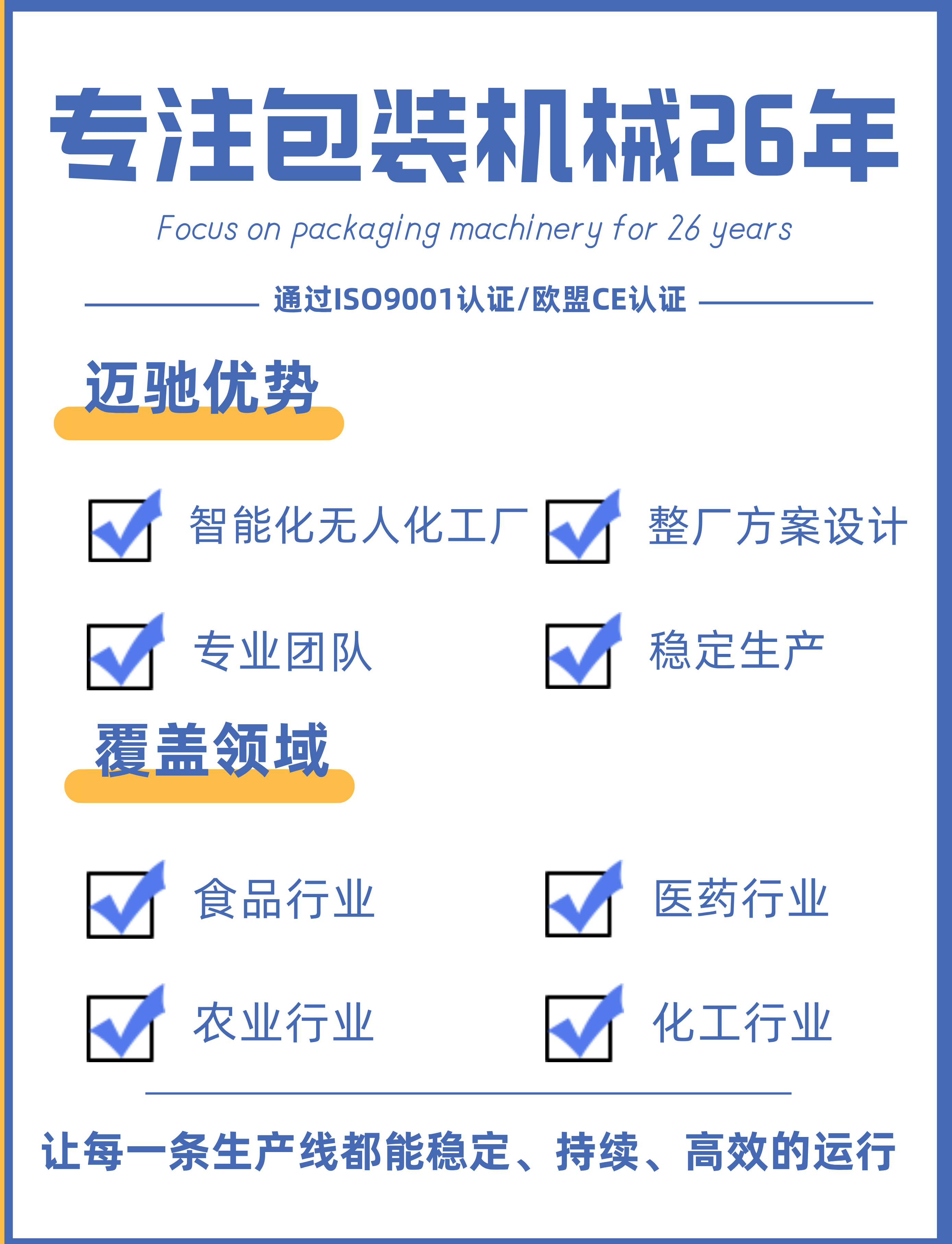 邁馳是一家專業(yè)生產(chǎn)全自動多列粉劑、粉末包裝機整線廠家,可根據(jù)客戶不同物料特性定制一對一方案,可根據(jù)產(chǎn)量定制列數(shù)-有序理料裝盒-自動裝箱-機器人碼垛。整廠方案設計...